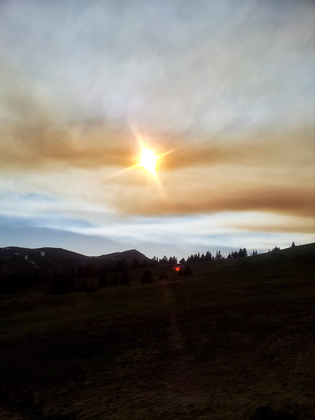 At dinner, the sky turned black with the sun completely enveloped by wildfire smoke. At 12,000ft having no sun to warm you up plus a chilly wind, I began to shiver. I needed about 5 more miles to get to a reasonable lower elevation. I plodded on. Mountain pine bark beetles kept pelting me as they leaped and flew from the pygmy alpine pines. Clouds of mosquitoes hovered around my head. At 7pm and 32m, all between 11,500-12,500ft, I laid down on a windy saddle and snuggled up in my sleeping bag. Dozing off, with the periodic whirr of a mosquito being non-distracting, I thought of my day. I was confused, my head boomed with pain. I thought that climbing up 6,000ft the previous day didn't help anything either. I did things normally, went about my day as usual, but I forgot to add into account the high, thin altitude. But my brain could not completely wrap itself around that notion.